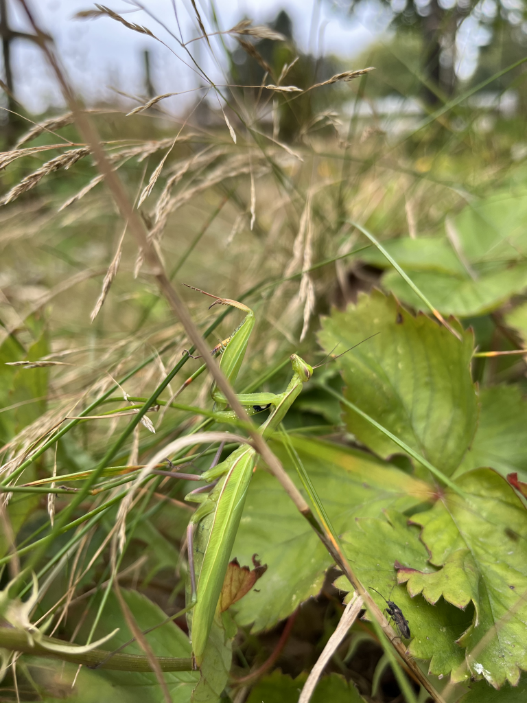Today as I weeded my garden, I had several delightful encounters with the residents of the garden: some interesting looking spiders, a couple small snakes, and this praying mantis. I felt a bit guilty, for after all the reason I was seeing them was that I was actively messing up their comfy homes, for they enjoy the weeds and overgrown places.