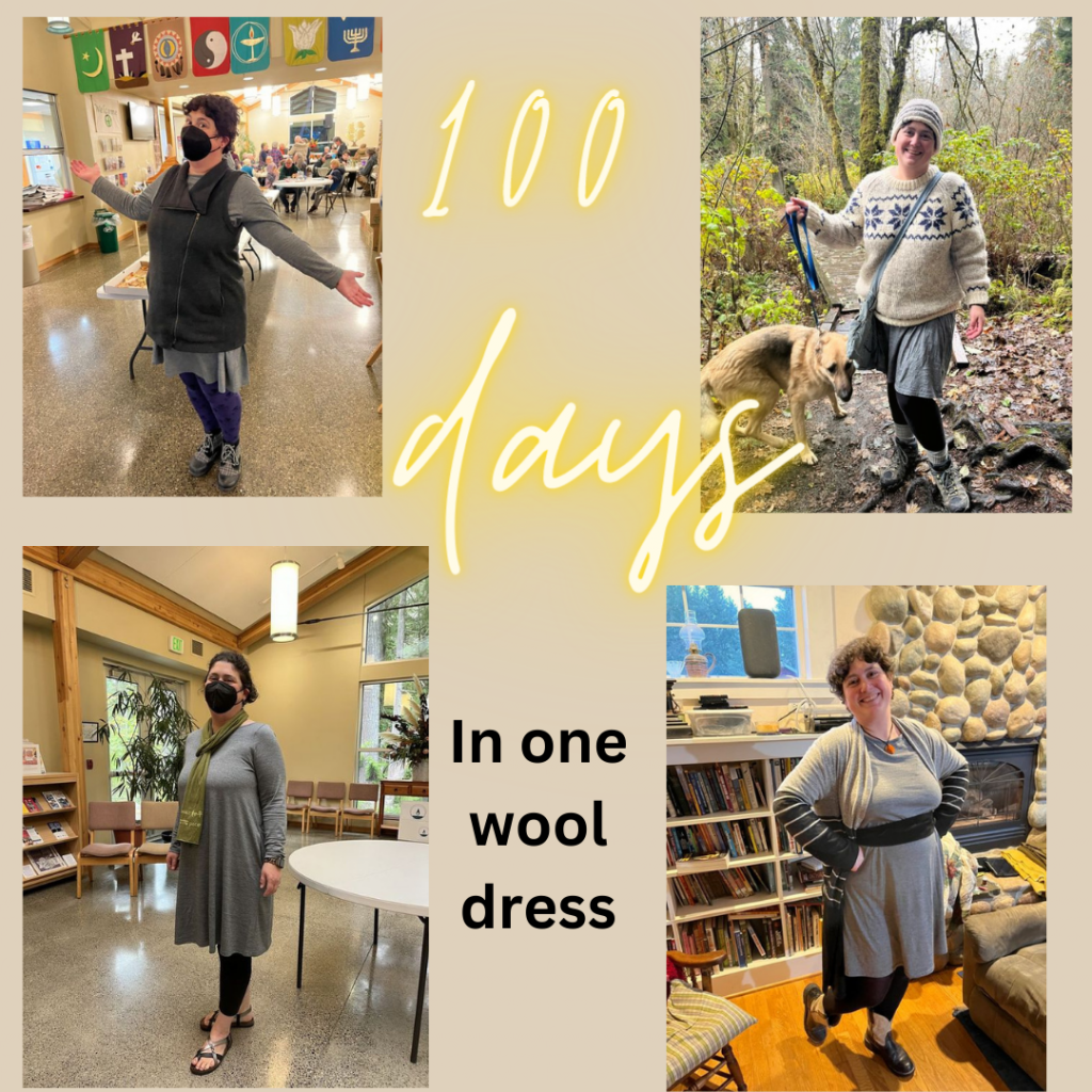 Today is my 100th day in a row wearing the same grey wool dress. You may have some questions – like what? Why? This is a challenge created by the clothing company Wool&, and officially to do the challenge and get the gift certificate prize at the end you have to do it in one of their pieces. But really, I wanted to do it because I had seen others take on the challenge and it seemed intriguing. What would I learn about my relationship to clothing and fashion and style if I wore one dress for 100 days straight?
